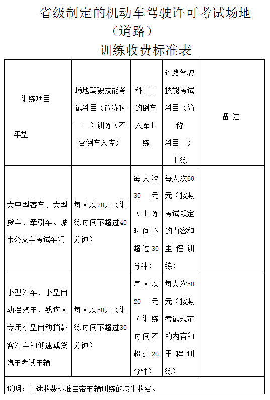 此次一并公布的还包括省定考前训练收费标准,其中C1照、C2照和残疾人驾照参加场地驾驶、倒车入库及大路考的模拟训练收费分别为每人次50元、20元和50元。记者了解到,目前南京的模拟考试收费标准,大路考模拟为150元,倒车入库也有收60元,此次降费后将大幅降低学驾人的学习考试成本。另外,自带车辆训练的可减半收取。