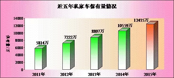 2015年,小型载客汽车达1.36亿辆,其中,以个人名义登记的小型载客汽车(私家车)达到1.24亿辆,占小型载客汽车的91.53%。与2014年相比,私家车增加1877万辆,增长17.77%。全国平均每百户家庭拥有31辆私家车,北京、成都、深圳等大城市每百户家庭拥有私家车超过60辆。