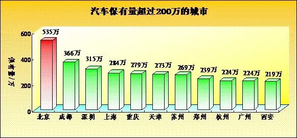 全国有40个城市的汽车保有量超过百万辆,北京、成都、深圳、上海、重庆、天津、苏州、郑州、杭州、广州、西安11个城市汽车保有量超过200万辆。